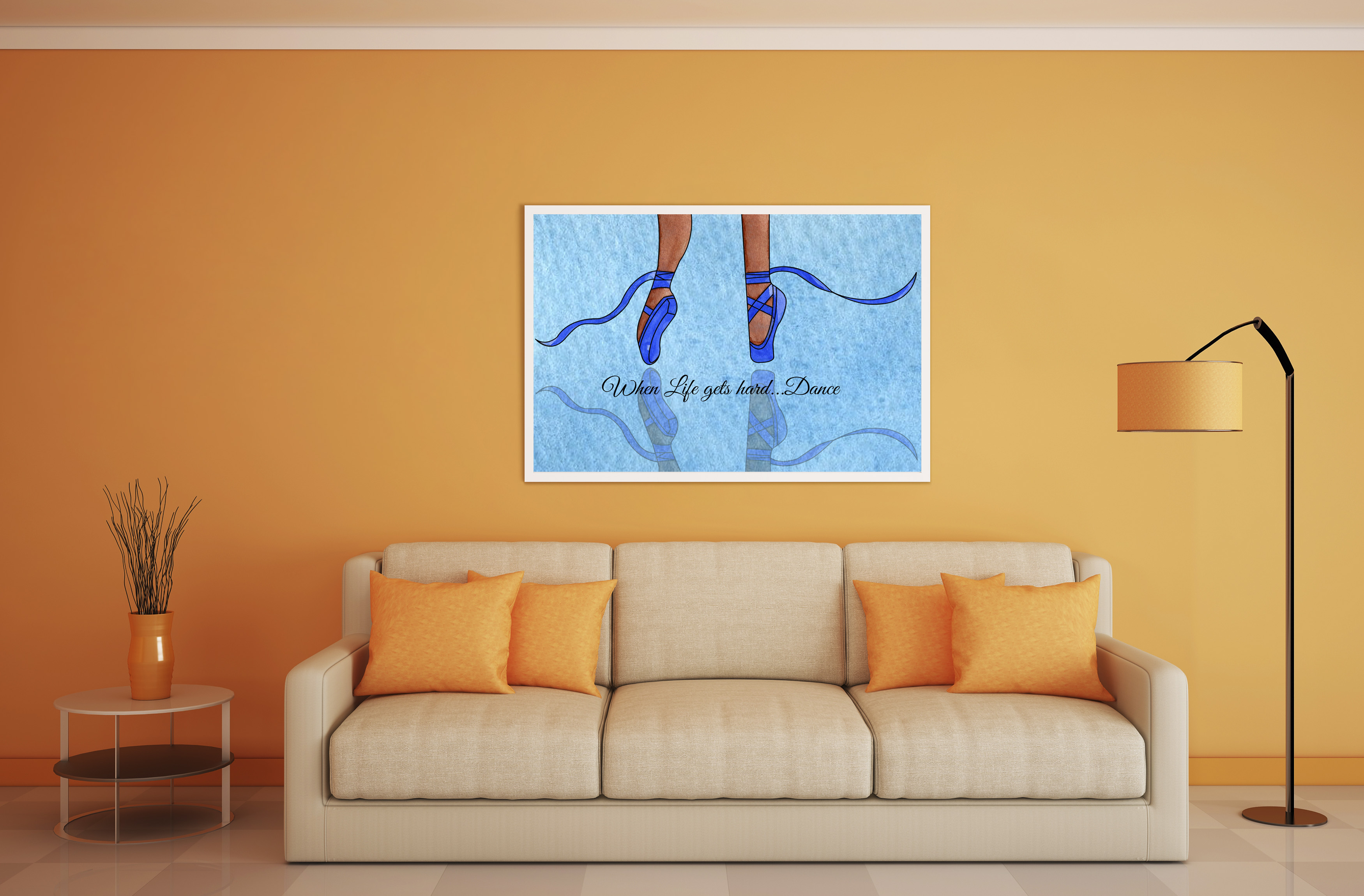 A watercolor painting of Ballerina Shoes in blue. Something nice for decoration along with an encouraging message. Landscape format.